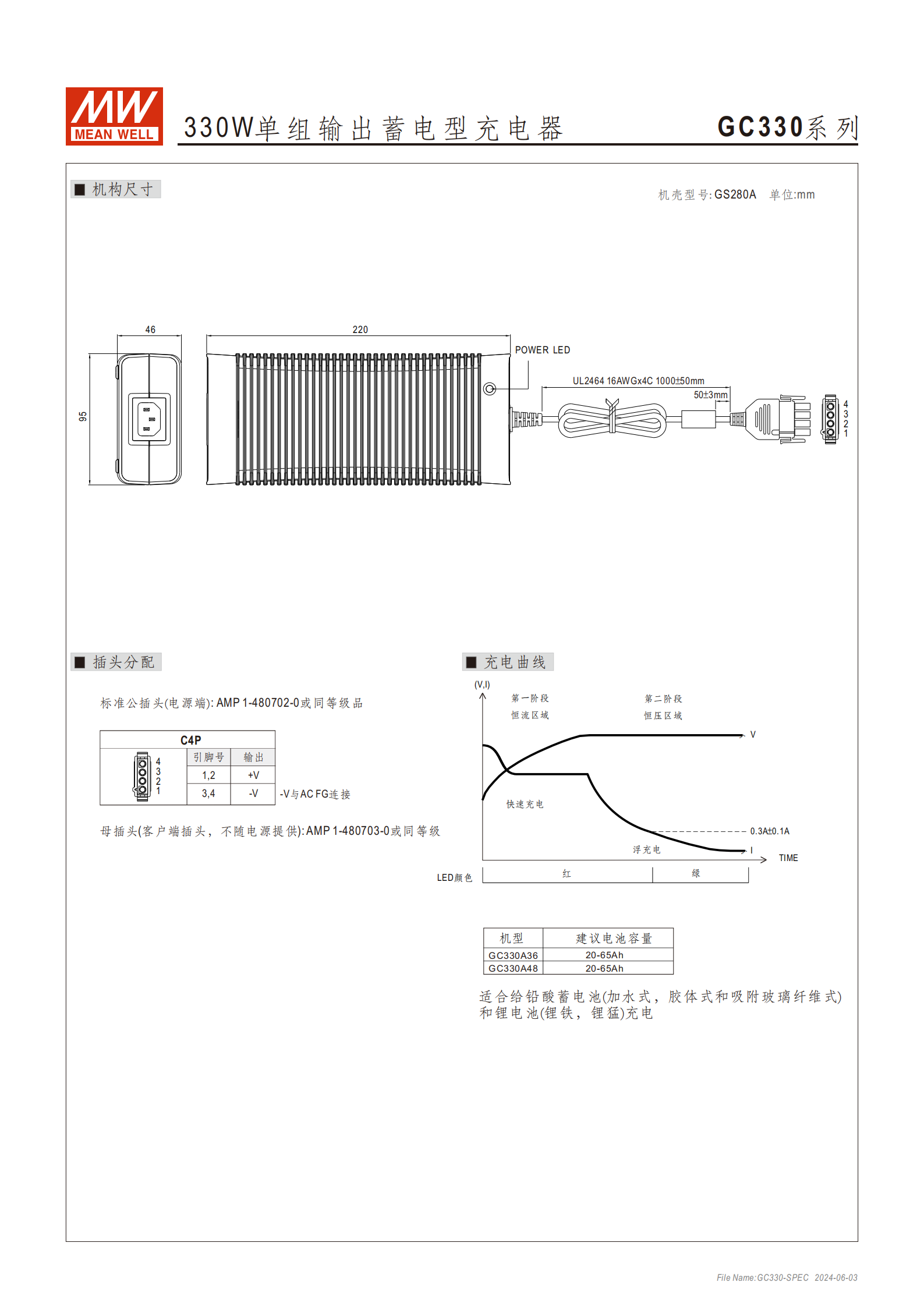 | GC330A48-C4P | 54.4V | 20 ~ 65Ah | 4.8A | 8A |
