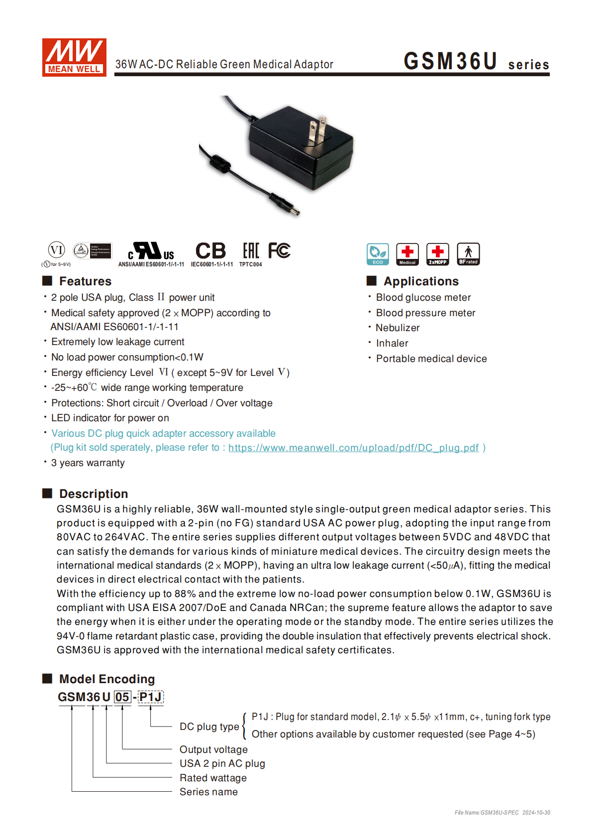 GSM36U 系列是明緯推出的36W 壁掛式 AC-DC 綠色醫(yī)療型適配器,采用 2 極美式插頭、Class Ⅱ 電源設(shè)計(jì),通過ANSI/AAMI ES60601-1/-1-11等國(guó)際醫(yī)療安規(guī)認(rèn)證(2xMOPP),漏電流 **<50μA**、空載消耗 **<0.1W**,輸出電壓覆蓋5V-48VDC,適配 80~264VAC 寬輸入,工作溫度 **-25~+60℃,具備短路 / 過負(fù)載 / 過電壓三重保護(hù),搭配可更換的 DC plug 轉(zhuǎn)接頭,外殼為 94V-0 防火塑料,提供3 年保固 **,MTBF 值達(dá) 3777.8K hrs(Telcordia SR-332),主要應(yīng)用于血糖儀、血壓計(jì)等便攜式醫(yī)療設(shè)備。