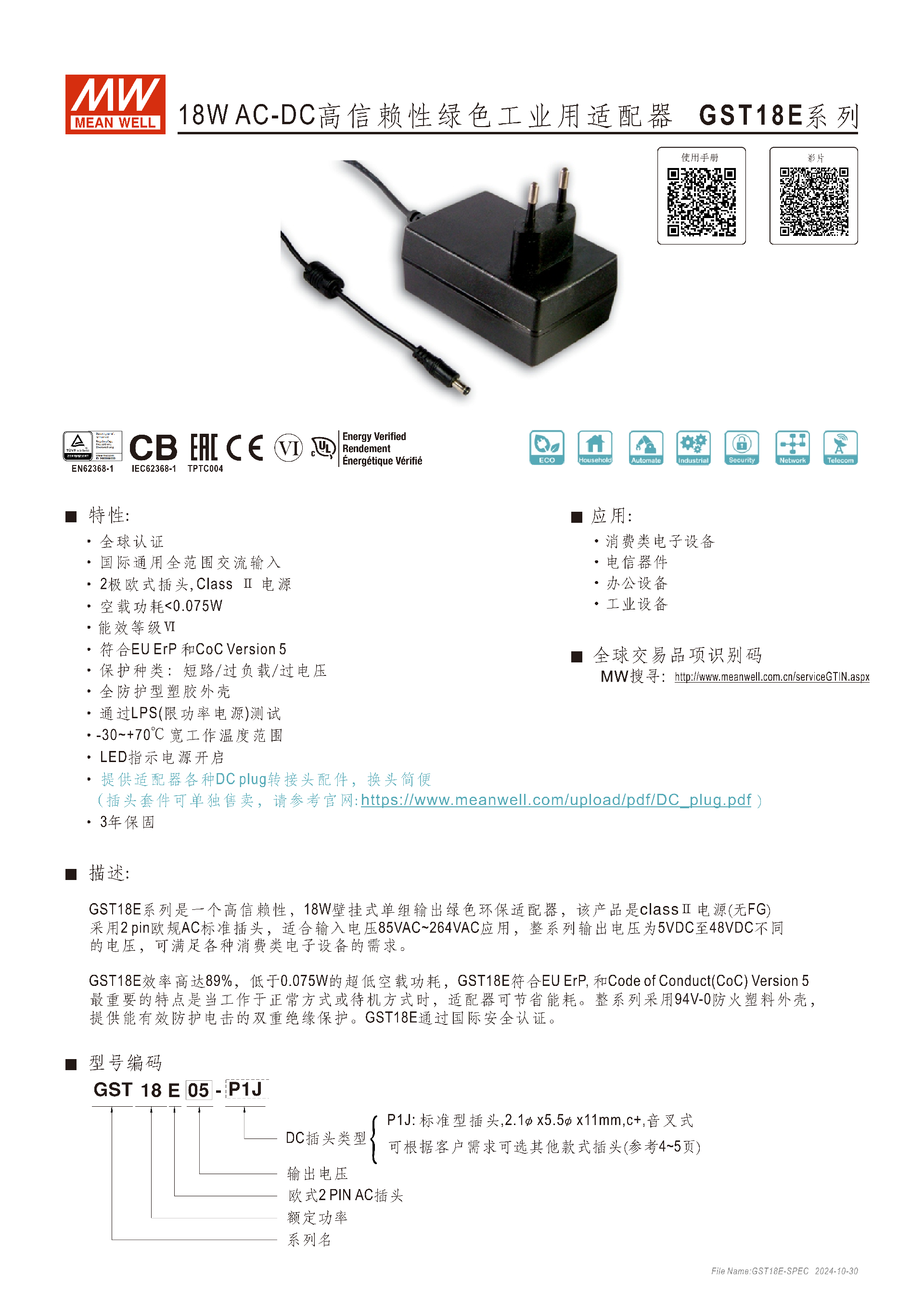 GST18E 系列是明緯推出的18W壁掛式單組輸出 AC-DC 綠色工業(yè)用適配器,為Class Ⅱ 無 FG 電源,配備 2 極歐式插頭,支持85VAC~264VAC全范圍交流輸入,輸出電壓覆蓋5VDC 至 48VDC多檔位,具備短路 / 過負(fù)載 / 過電壓三重保護(hù),空載功耗 **<0.075W**、最高效率89% 且符合能效等級(jí) Ⅵ 及 EU ErP、CoC Version 5 標(biāo)準(zhǔn),工作溫度寬至 **-30~+70℃,采用 94V-0 防火塑料外殼和雙重絕緣保護(hù),通過多項(xiàng)國際安全與 EMC 認(rèn)證,MTBF 值最高達(dá)3879.7K hrs**,還支持多種 DC plug 轉(zhuǎn)接頭更換,提供3 年保固,適用于消費(fèi)類電子、電信器件、辦公及工業(yè)設(shè)備等場(chǎng)景。