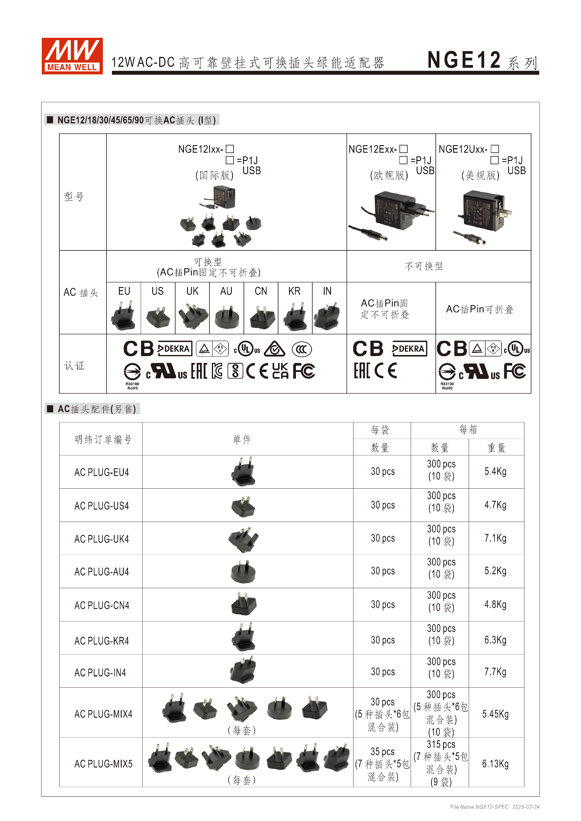 AC 插頭配件(另售):提供 EU/US/UK/AU/CN/KR/IN7 種單獨插頭,還有 MIX4(5 種混合)、MIX5(7 種混合)裝,每袋 30pcs/35pcs,每箱 300pcs/315pcs;國際版 (I) 主體與 AC 插頭需單獨訂購,且必須搭配使用;