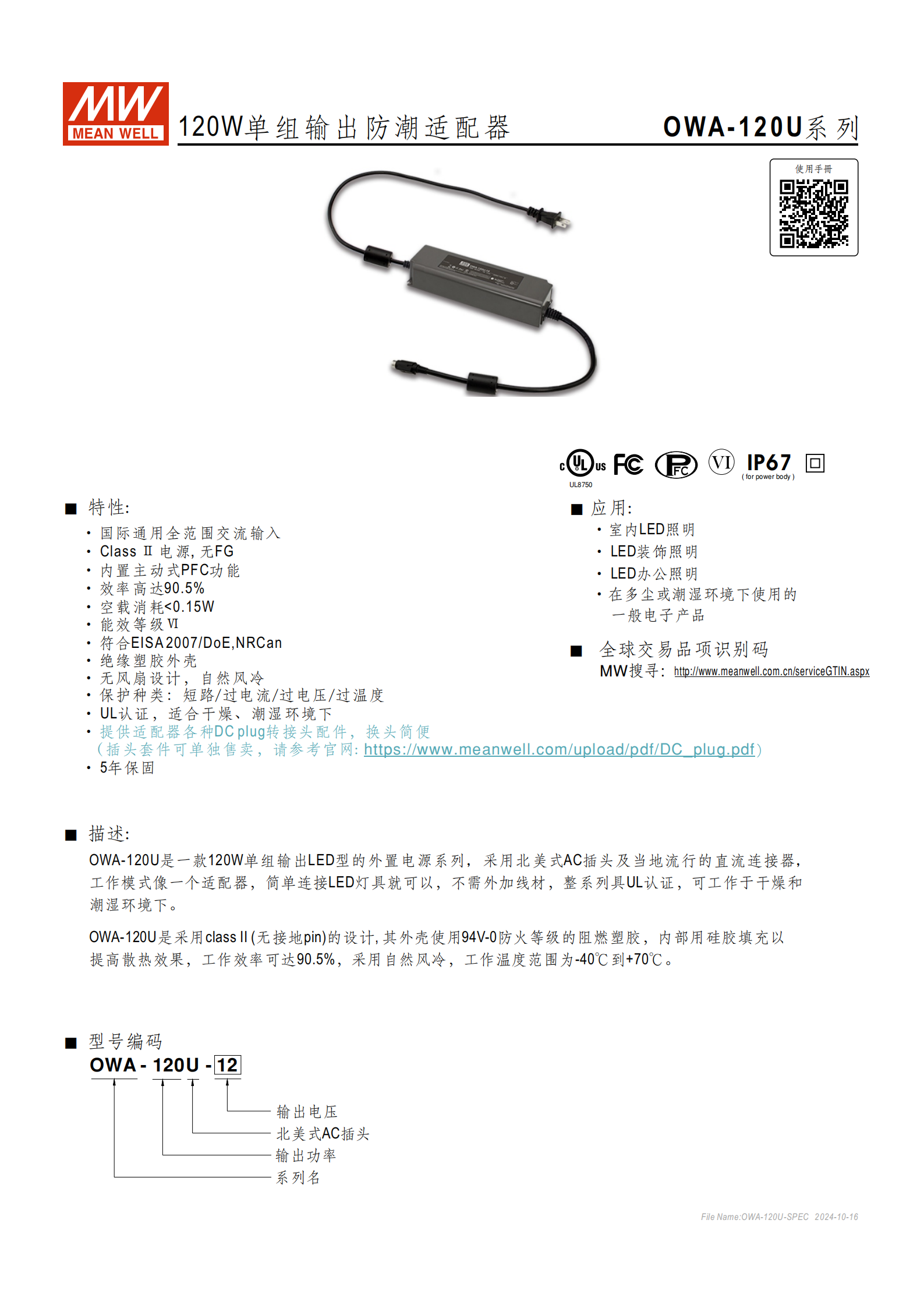 明緯OWA-200U 系列為200W 單組輸出防潮適配器,采用北美式 AC 插頭與多規(guī)格 DC 連接器,是 Class II 無接地設(shè)計(jì)的外置電源,主體達(dá)IP67防護(hù)等級,適配干燥、潮濕、多塵等復(fù)雜環(huán)境,提供5 年保固,DC 插頭轉(zhuǎn)接頭可單獨(dú)選購且更換簡便。