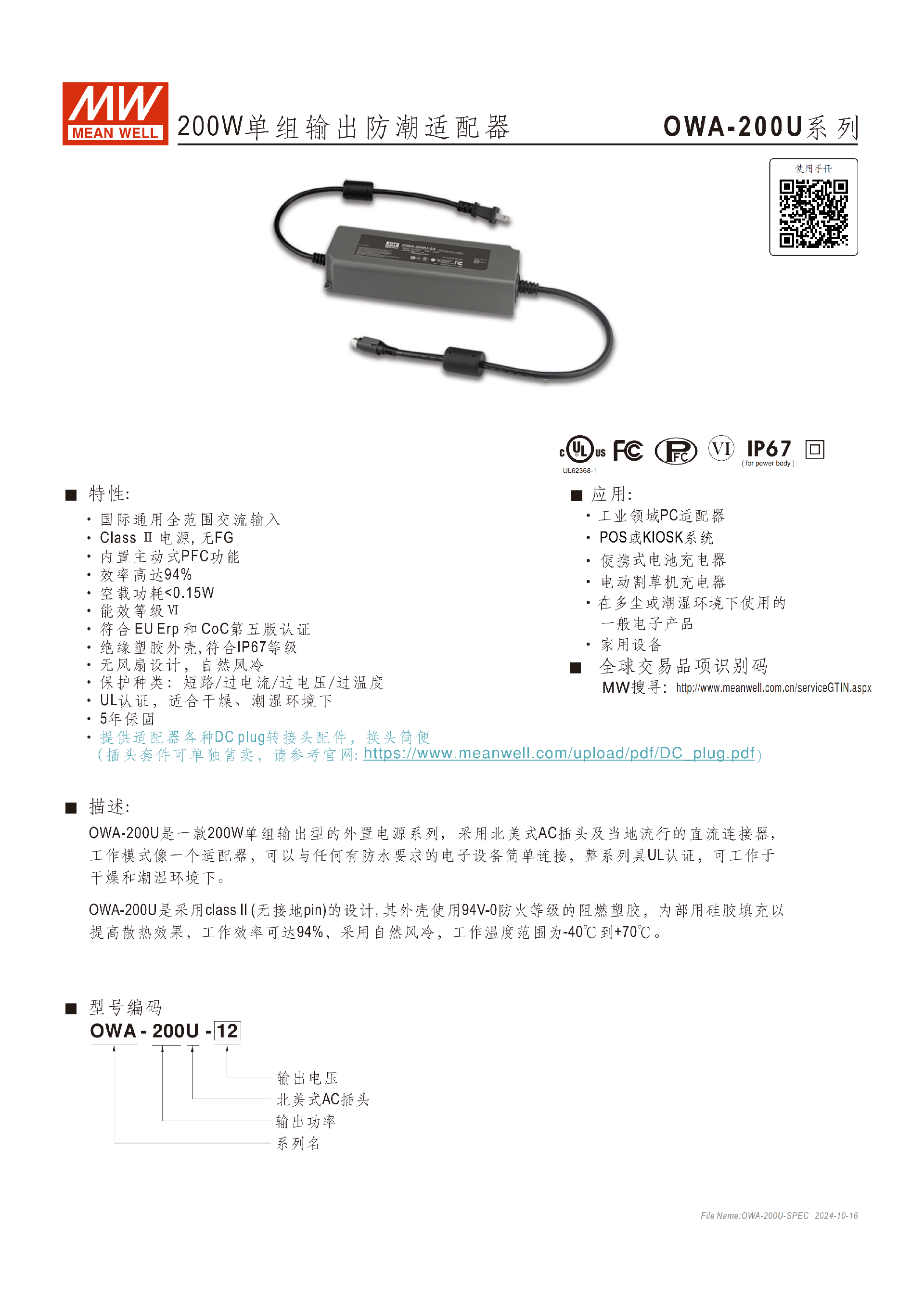 明緯OWA-200U 系列是 200W 單組輸出防潮適配器,具備IP67(僅主體)防護(hù)等級(jí)與Class II 無(wú)接地設(shè)計(jì),采用 94V-0 阻燃塑膠外殼并內(nèi)置硅膠填充,支持 **-40℃至 + 70℃寬溫工作,擁有國(guó)際通用全范圍交流輸入 **、主動(dòng)式 PFC功能,效率最高達(dá)94%,空載功耗 <0.15W,通過 UL62368-1 等認(rèn)證且提供5 年保固;該系列含 7 款不同輸出電壓機(jī)型,額定功率最高 200W,配備短路 / 過流 / 過壓 / 過溫四重保護(hù),適配工業(yè) PC、POS 系統(tǒng)、電池充電器等多場(chǎng)景,支持多款 DC 插頭更換,安裝與使用靈活。