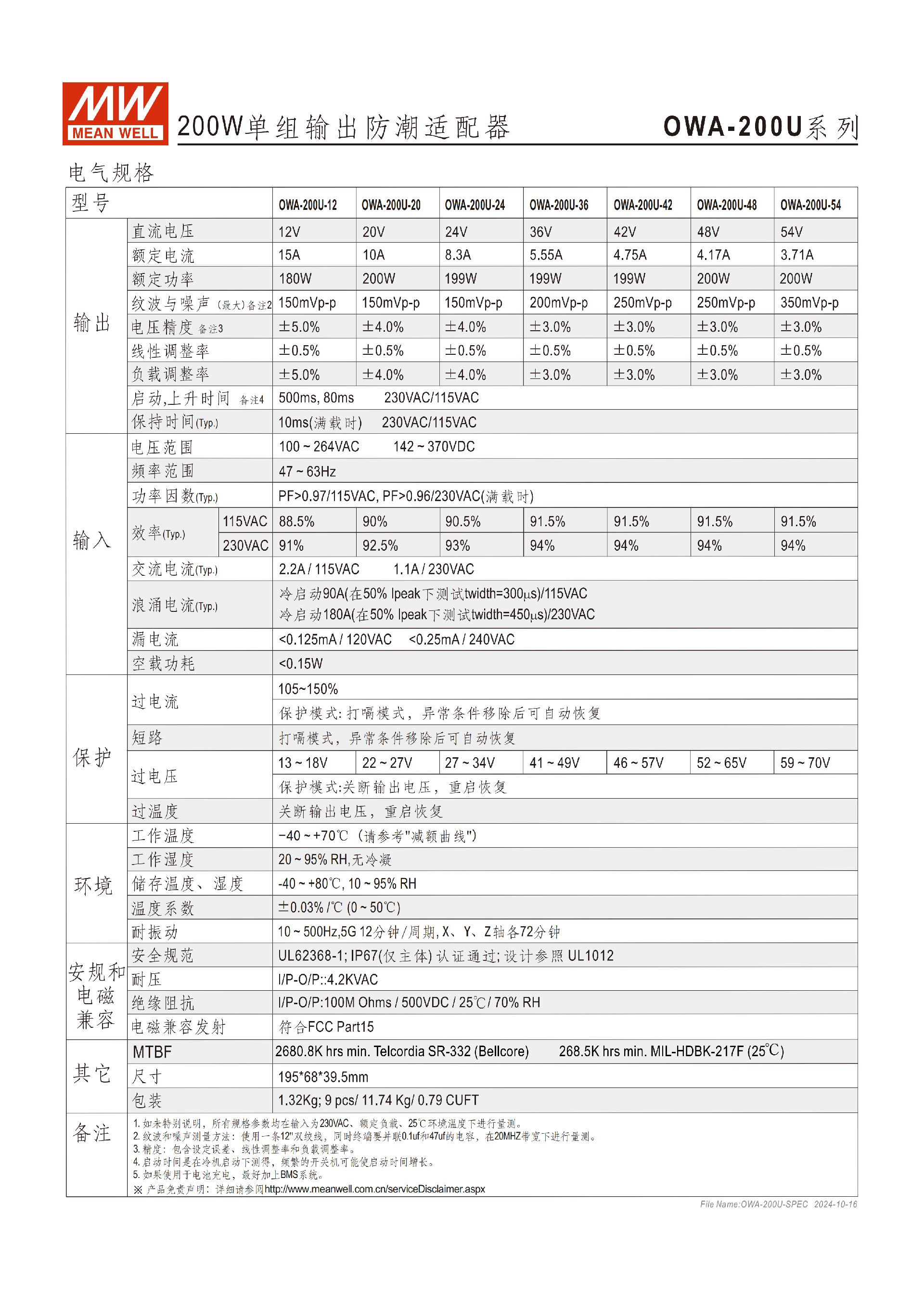 該系列按輸出電壓分 7 款機(jī)型,型號(hào)編碼規(guī)則為OWA-200U - 輸出電壓,所有參數(shù)若無(wú)特別說明,均在 230VAC 輸入、額定負(fù)載、25℃環(huán)境下測(cè)量,核心電氣規(guī)格如下表: