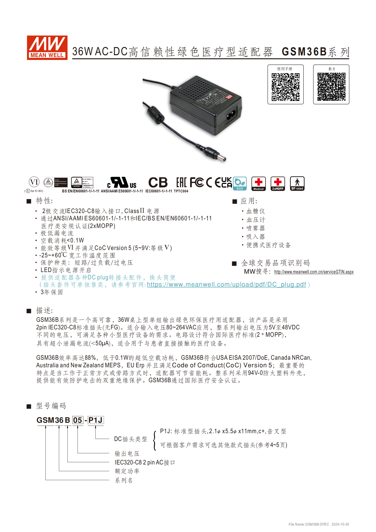 GSM36B 系列是明緯推出的36W AC-DC 桌上型綠色醫(yī)療型適配器,采用 2pin IEC320-C8 輸入接口、Class Ⅱ 電源設(shè)計(jì),通過2xMOPP國際醫(yī)療安規(guī)認(rèn)證,漏電流 **<50μA**,適配80~264VAC寬輸入電壓,輸出電壓覆蓋5~48VDC,具備短路 / 過負(fù)載 / 過電壓三重保護(hù),空載消耗 **<0.1W**、效率最高88%,工作溫度范圍 **-25~+60℃,適配血糖儀、血壓計(jì)等便攜式醫(yī)療設(shè)備,提供3 年保固 **,支持 DC 插頭定制與快速轉(zhuǎn)接,外殼為 94V-0 防火塑料且具備雙重絕緣保護(hù)。