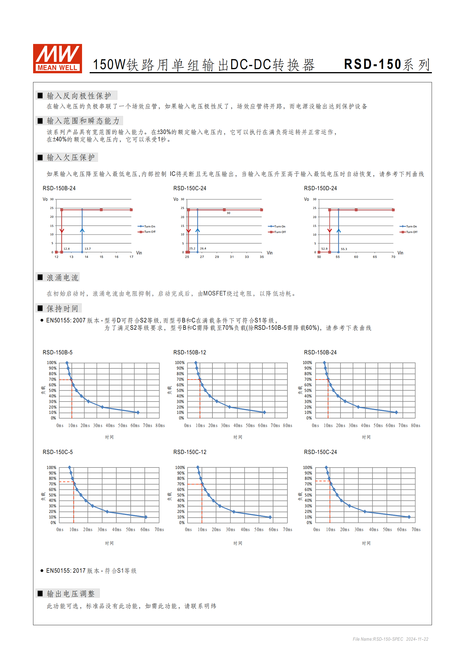 問題 1(產(chǎn)品適配性):RSD-150 系列不同型號在鐵路電壓中斷標(biāo)準(zhǔn)(EN50155)中的適配性有何差異?
