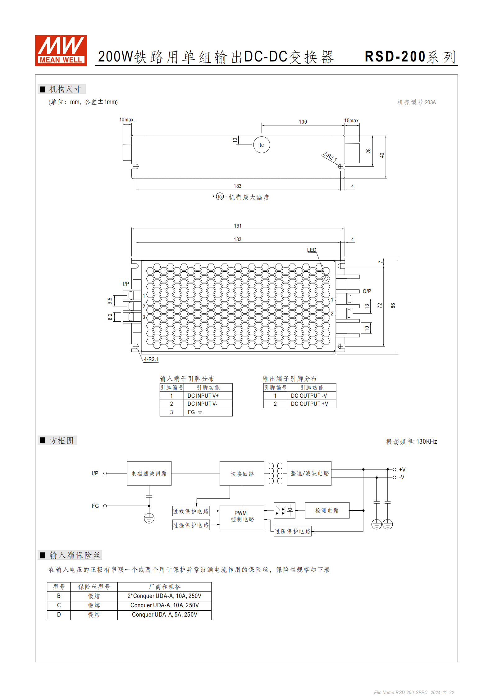 RSD-200B-48:輸出 48V/4.2A,額定功率 201.6W,紋波噪聲 180mVp-p