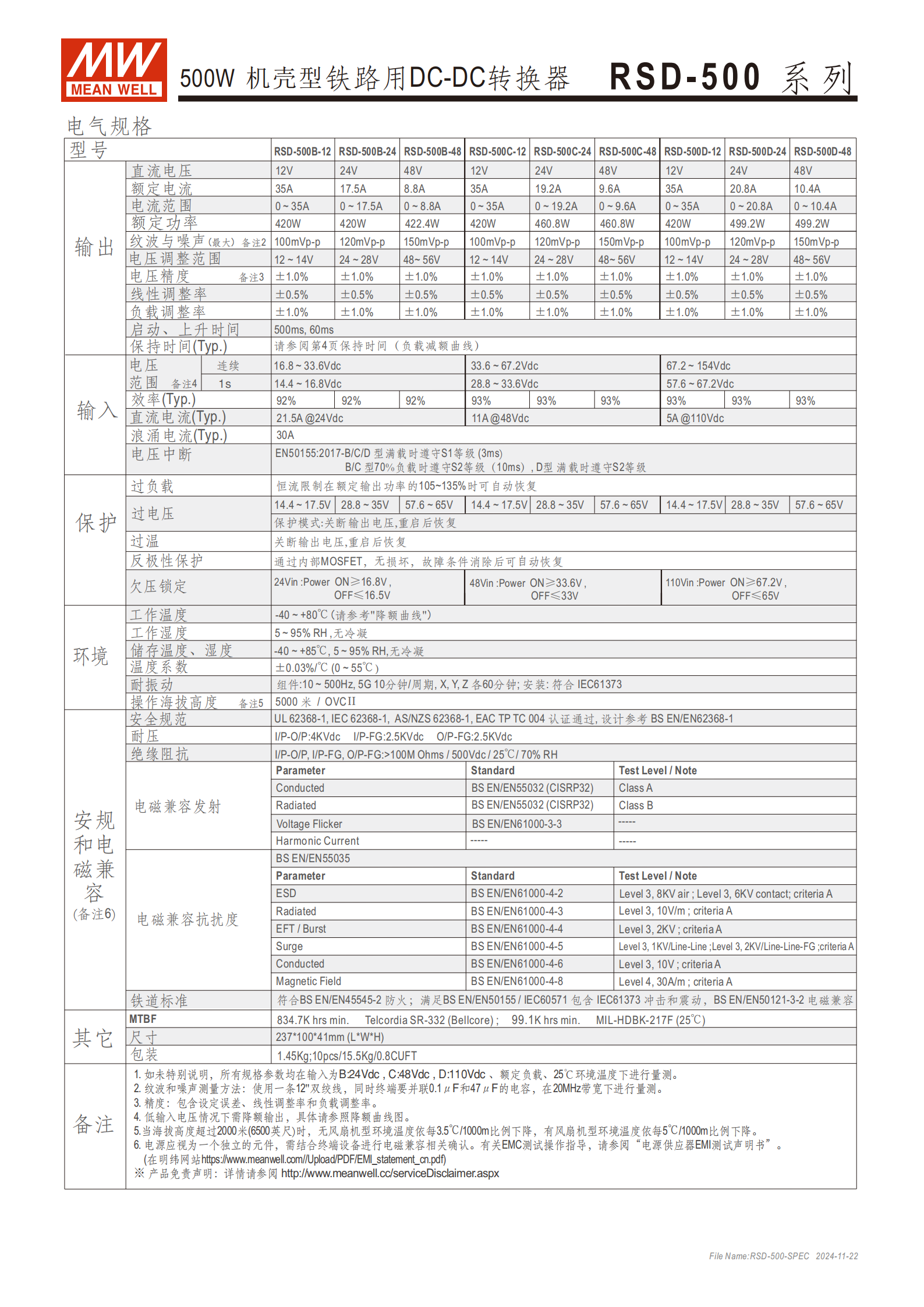 RSD-500 系列為明緯生產的500W 機殼型鐵路專用 DC-DC 轉換器,是面向軌道交通及惡劣工業(yè)環(huán)境的電源轉換產品,核心符合鐵道標準EN50155(2017 版)和EN45545-2,同時通過IEC62368-1、UL62368-1、AS/NZS62368-1等安規(guī)認證,提供3 年保固,為全球交易品項。