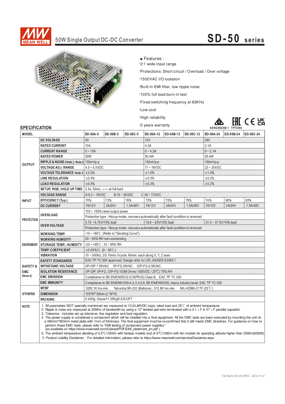 SD-50 系列是明緯推出的 50W 單組輸出 DC-DC 轉(zhuǎn)換器,具備2:1 寬范圍輸入、1500VAC 輸入 / 輸出隔離、內(nèi)建 EMI 濾波電路的核心特性,開關(guān)工作頻率為83KHZ,通過多項(xiàng)安規(guī)與電磁兼容認(rèn)證,MTBF 值最低達(dá) 3293.1K hrs,提供 2 年保固;產(chǎn)品分 A/B/C 三類輸入電壓規(guī)格,對應(yīng)輸出 5V/12V/24V,具備短路、過負(fù)載、過電壓三重保護(hù)(保護(hù)模式為打嗝模式且可自動恢復(fù)),整機(jī)尺寸1599738mm,經(jīng) 100% 滿載老化測試,兼具低成本、高信賴性的特點(diǎn)。