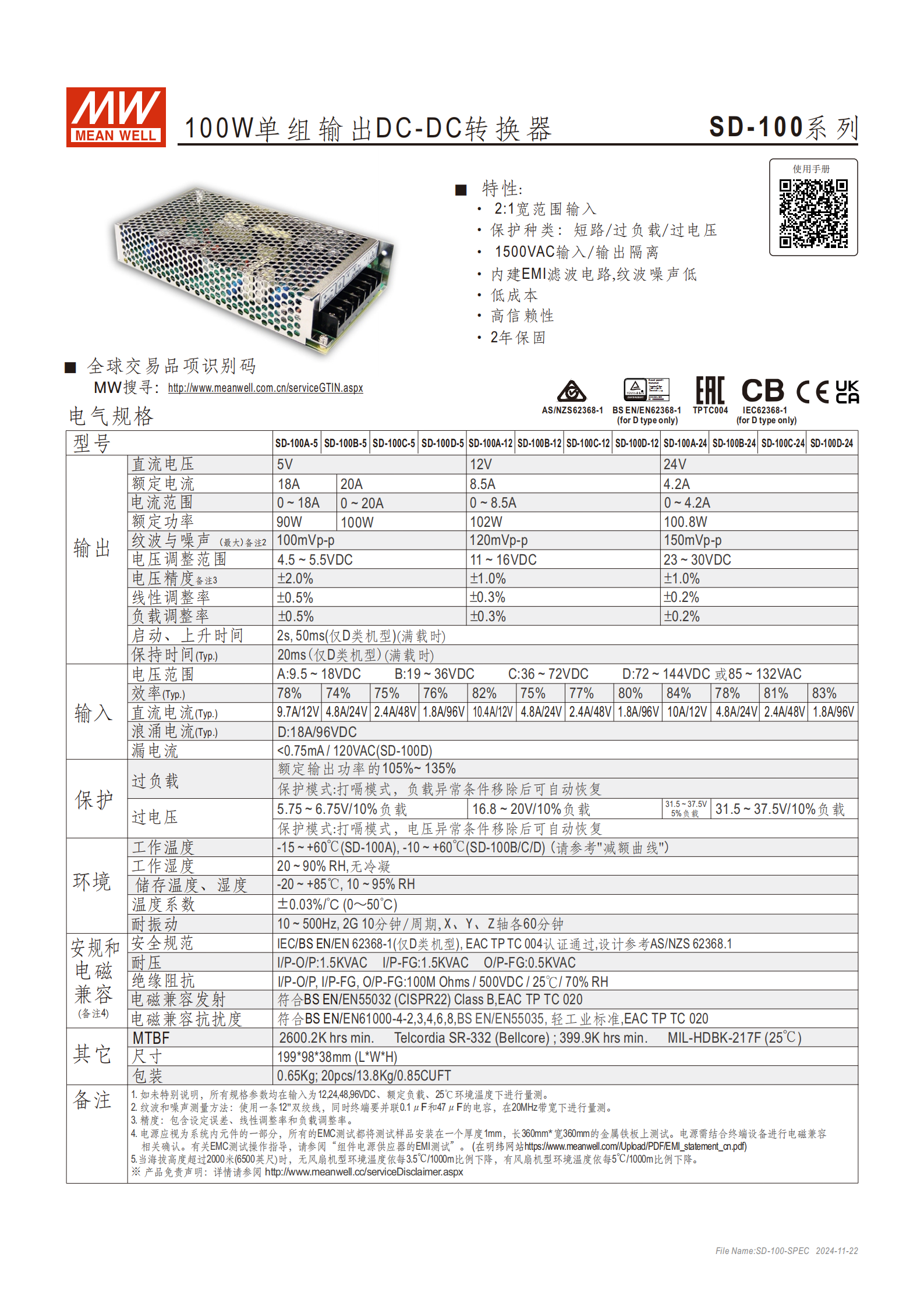 明緯 SD-100 系列為 100W 級(jí)單組輸出 DC-DC 轉(zhuǎn)換器,具備2:1 寬范圍輸入、1500VAC 輸入 / 輸出隔離特性,內(nèi)建 EMI 濾波電路且紋波噪聲低,擁有短路 / 過負(fù)載 / 過電壓三重保護(hù),整機(jī)高信賴性且提供2 年保固;該系列分 A/B/C/D 四類機(jī)型,輸出電壓涵蓋5V、12V、24V,額定功率最高達(dá) 102W,工作溫度依機(jī)型不同為 - 15~+60℃或 - 10~+60℃,安規(guī)符合 IEC/BS EN/EN62368-1 等標(biāo)準(zhǔn),MTBF 最低達(dá) 399.9K hrs,機(jī)身尺寸為1999838mm,引腳有明確的輸入、接地、輸出定義,同時(shí)需根據(jù)環(huán)境溫度和輸入電壓遵循對(duì)應(yīng)的負(fù)載減額要求。