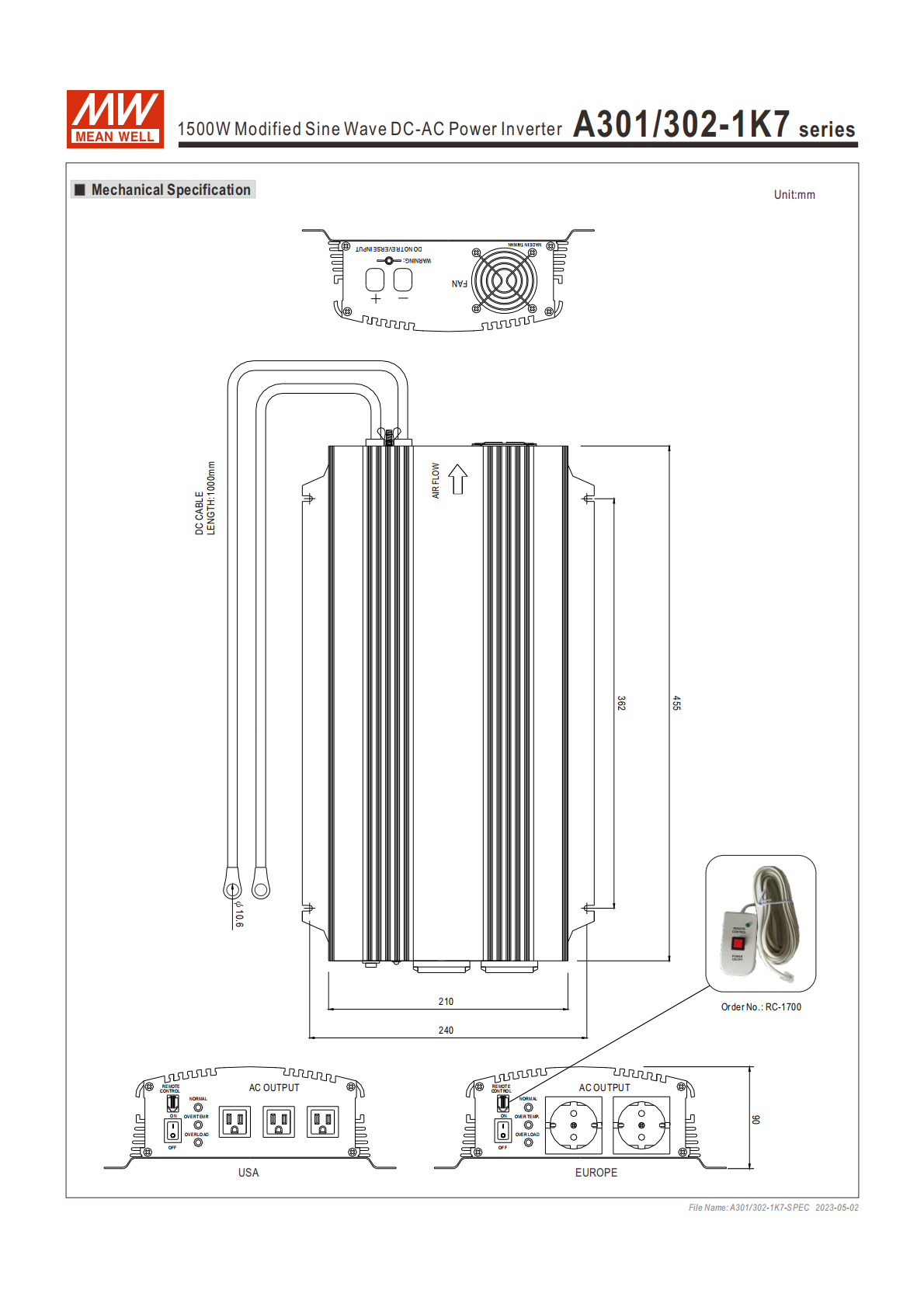 A301/302-1K7 系列為 1500W 修正正弦波 DC-AC 逆變器,支持12V/24V 直流輸入,交流輸出分110V/230V規(guī)格,額定功率 1500W、30 分鐘最大功率 1700W、浪涌功率 3000W,具備多重保護(hù)功能與開(kāi)關(guān)控制冷卻風(fēng)扇,擁有 E13/EAC/CE/UKCA 等認(rèn)證,1 年保固,適配家用、車(chē)載、船舶等多場(chǎng)景,機(jī)身尺寸45521085mm,還可選配開(kāi) / 關(guān)遙控(訂購(gòu)編碼 RC-1700)與多種規(guī)格交流輸出插座。