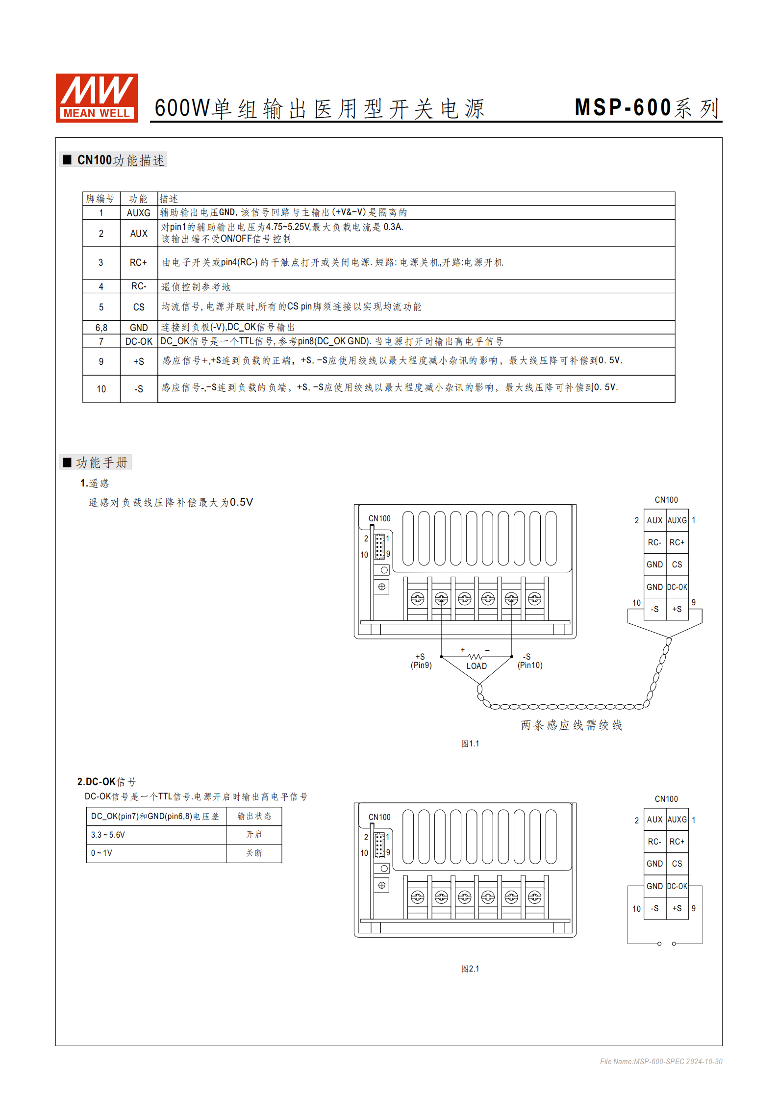 | 7 | DC-OK | DC正常信號(TTL電平)。高電平(3.3-5.6V)表示電源正常。 |