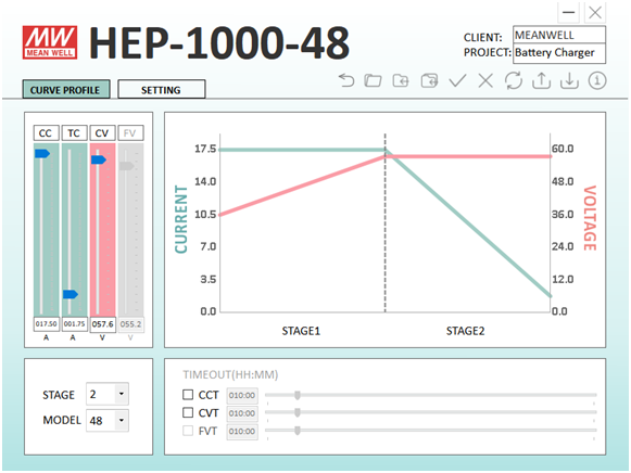 用戶只需要在軟件中選擇二段式充電模式,HEP-1000-48便可用于鋰電池充電,可調(diào)整的電壓及電流范圍不變。例如給一顆20Ah,最大充電電壓為56V的磷酸鋰鐵電池充電,使用者可將圖四所示的‘CV’及‘CC’選項(xiàng)調(diào)至56V及17.5A。如此可得到最快速的充電方案。使用者也可以選擇較低的恒流點(diǎn)避免高電流導(dǎo)致的高溫和較低的恒壓點(diǎn)以保證不會(huì)過(guò)度充電。