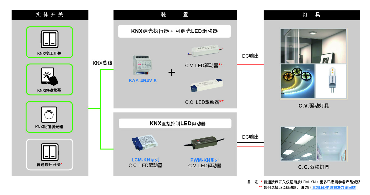 明緯KNX調(diào)光裝置可以連接到各種控制設(shè)備以執(zhí)行調(diào)光??膳c各種恆壓型 ( C.V.) 驅(qū)動(dòng)或恆流型 (C.C.)驅(qū)動(dòng)的傳統(tǒng)LED 驅(qū)動(dòng)器搭配應(yīng)用,以滿足不同應(yīng)用場(chǎng)景的需求。